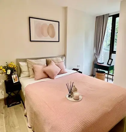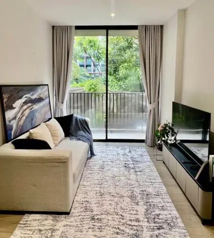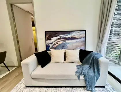 Fynn Asoke is a stylish low-rise condominium tucked away in the lively Asoke neighborhood of Bangkok, just a short walk from MRT Phetchaburi and BTS Asoke. Designed with a modern boutique feel, Fynn Asoke offers chic residences with smart layouts, high-quality finishes, and large windows that bring in plenty of natural light. It’s a great choice for young professionals, couples, or anyone who wants a trendy city home in one of Bangkok’s most connected areas. This is a stylishly decorated and well furnished 1 bedroom, 1 bathroom condo available to rent. The condo measures 37 sqm and is nicely situated on the 2nd floor of this low-rise condominium.