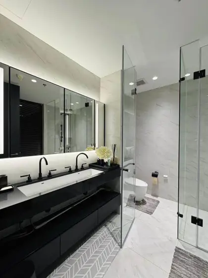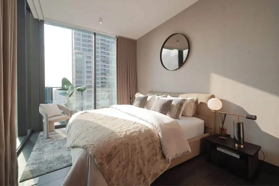 The architectural design is striking: a sloped “iconic” profile created by Architect A49, using extensive glass panels to maximize both natural light and panoramic city views. The building houses approximately 231–238 units, ranging from 1-bedroom (around 40–67 sqm) to 2- and 3-bedroom layouts (up to 154 sqm). Many units feature high ceilings (around 3 meters) and full-height double-glazed curtain walls for excellent insulation and privacy.