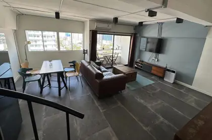 Thonglor Tower on Sukhumvit 55 has this duplex 2 bedroom, 2 bathroom condo available to rent. The loft style condo measures 100 sqm., comes fully furnished in a modern style and is situated on floors 17 and 18. Thonglor Tower has a swimming pool, gym, lounge, security service and parking.