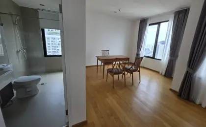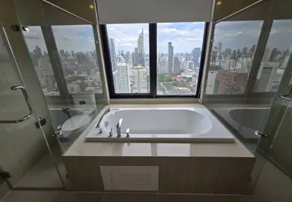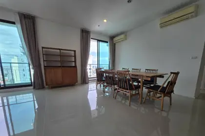 On the market for rent at Villa Asoke, near Petchaburi MRT Station and the Airport Rail Link, is this 4 bedroom penthouse on the 42nd floor. The property measures 312.8 sqm, has a private garden terrace, comes with 3 car parking spaces and is for sale unfurnished. There are 2 kitchens and a spare room. The building has a nice swimming pool, sauna, games room, lounge and fitness center as well as the expected parking and security service.